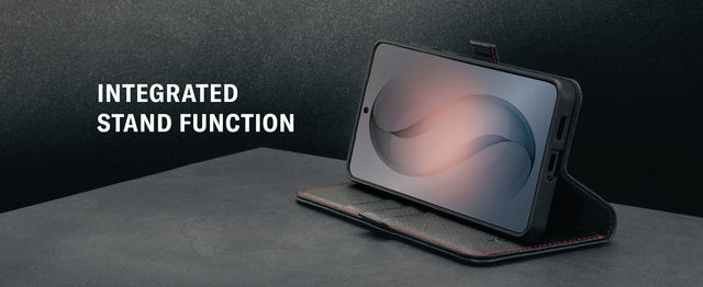 The Galaxy S26 case features an integrated stand function facilitating horizontal screen viewing. The case also features 3 credit card slots as well as a larger compartment for notes. The side magnetic clasp ensures a secure closure while maintaining an overall slim profile.